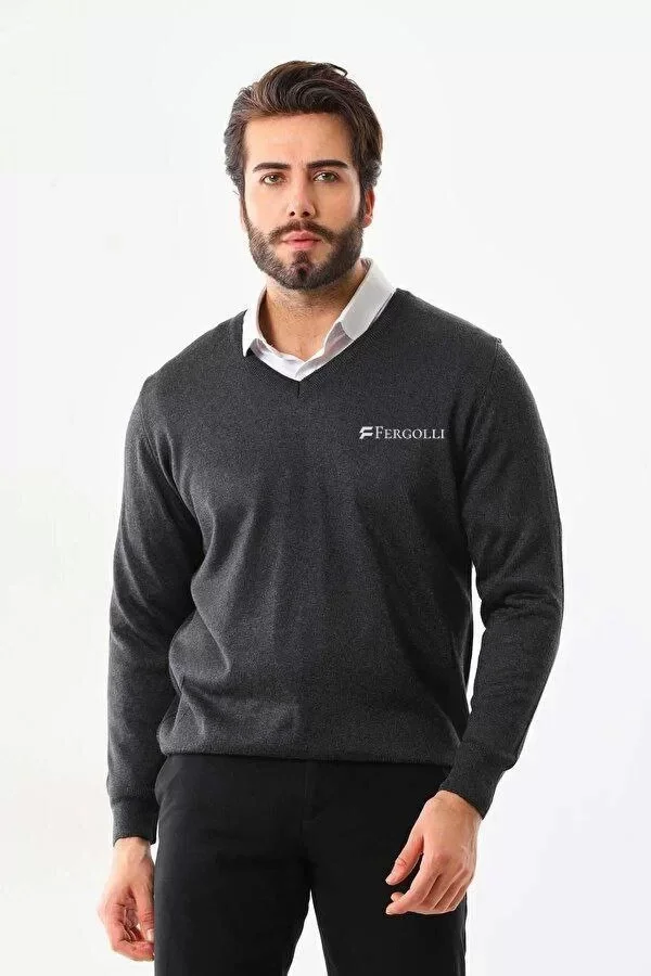 Baskılı V Yaka Uzun Kol Dokuma Triko - Füme