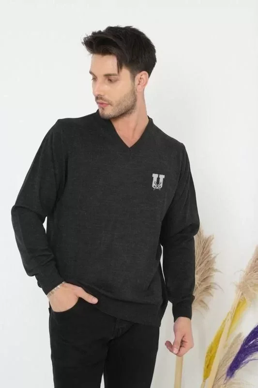 Baskılı V Yaka Uzun Kol Dokuma Triko - Füme