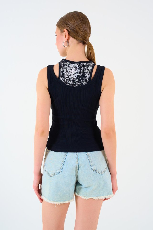 İçi Baskılı Halter Yaka Kaşkorse Atlet - Siyah