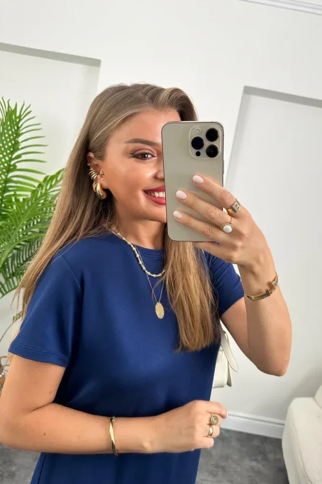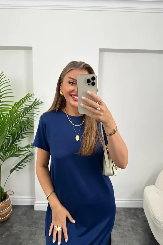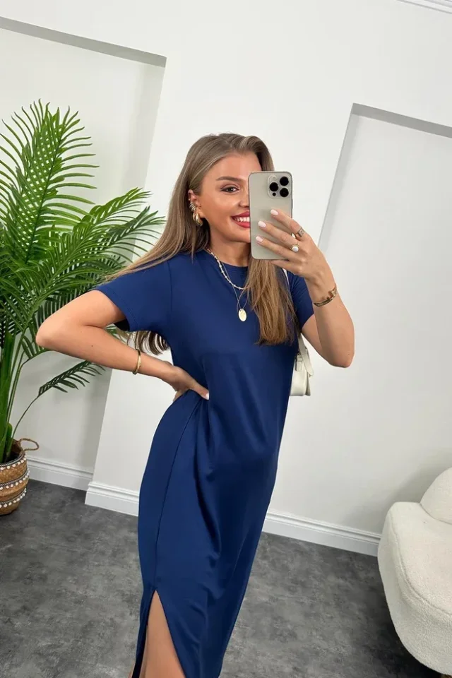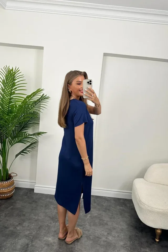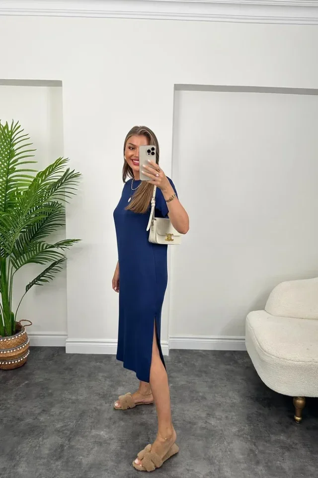 Kadın Kısa Kollu çift Yırtmaç Detaylı Salaş Viskon Elbise